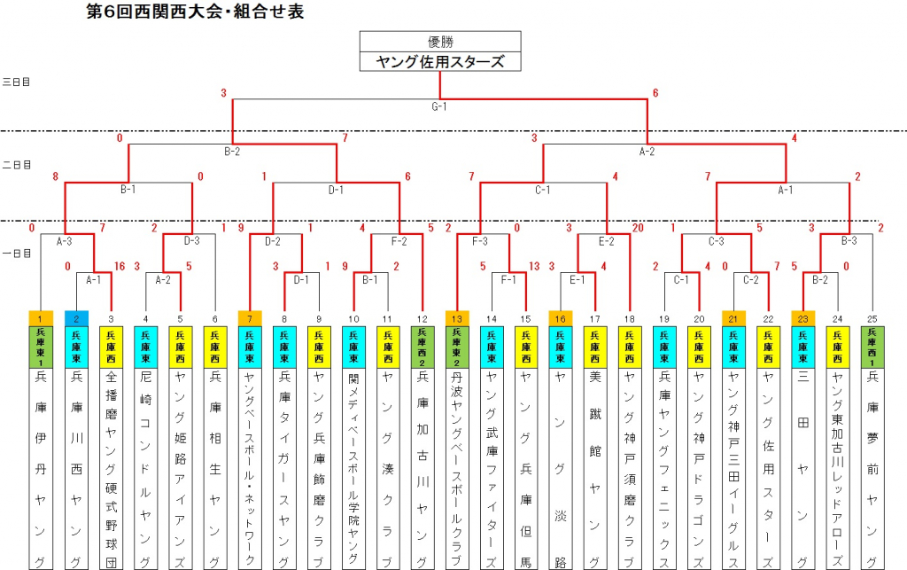 | 丹波ヤングベースボールクラブ | 4 | 2 | 0 | 0 | 1 | 0 | x | 7 |
